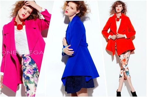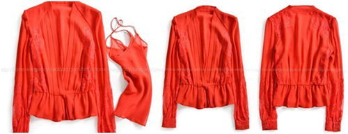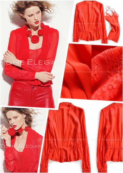 或許沒有哪個女人能抵擋的蕾絲誘惑,極具女人味的繡花蕾絲,華貴,性感而神秘,設計師將它巧妙拼接在衣身和雙袖上,精美的花紋,隱約透露的膚色,立即為整體增添了幾分嫵媚與浪漫。很有女人味的一款外套,名媛氣質。明艷的中國紅色與精致優雅的剪裁,結合柔軟的絲質面料,打造出輕盈飄逸而柔美的外觀。褶裥領襟設計,內置按扣,腰部縮褶,延伸下擺和內襯形成雙層褶皺荷葉擺的特色造型。當紅與粉、紅與藍不期而遇,偶爾的放縱或許就是奇遇的開始。玫瑰豈止是香艷:愛在深秋,故事還在繼續。