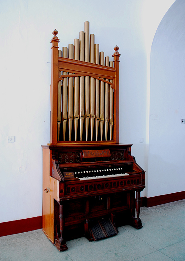 管風(fēng)琴由音管、音栓、鍵盤、軌桿機(jī)、風(fēng)箱、琴箱組成。管風(fēng)琴的音管一般為哨管和簧管兩種不同發(fā)音方式的管,以哨管為主體,大都以木料制成。音栓也叫拉栓,是圓形突鈕,可推進(jìn)推出,通過軌桿機(jī)操縱滑板,控制音管;滑板上有與該排各音管對應(yīng)的洞孔。音栓主要有:主要栓、笛音栓、弦音栓、簧音栓、變化音栓、混合音栓、聯(lián)鍵音栓等。管風(fēng)琴音量洪大,氣勢雄偉,音色優(yōu)美、莊重,并有多樣化對比、能模仿管弦樂器效果,能演奏豐富的和聲。