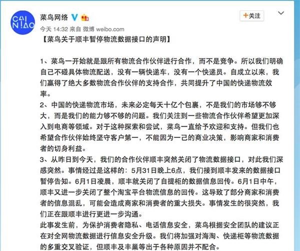 菜鳥聲明中稱道:順豐關閉了整個淘寶平臺物流信息的回傳。這導致了部分商家和消費者的信息混亂,可能會造成商家和消費者的重大損失。事情發生得很突然,我們正在跟順豐進行更進一步溝通。